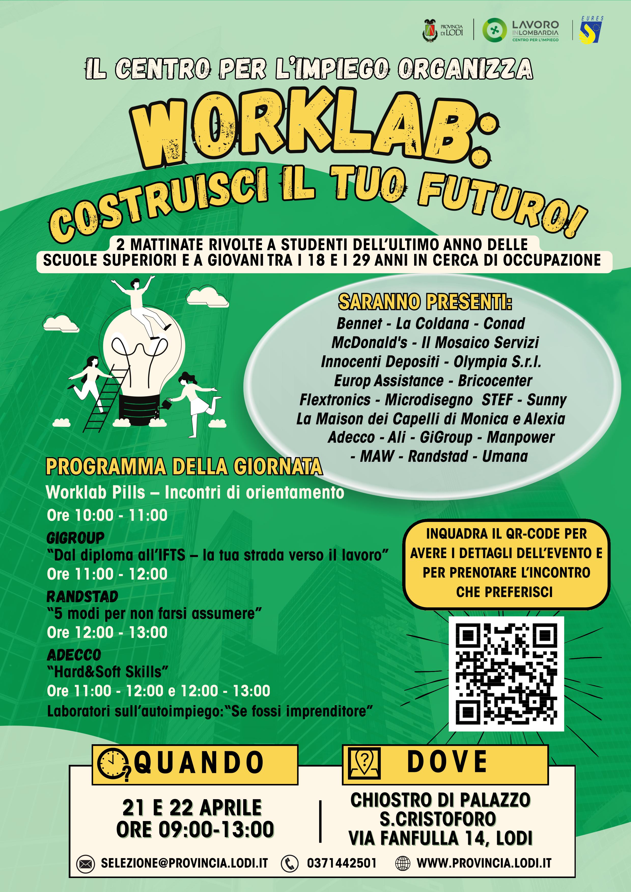 EVENTO "WORKLAB - COSTRUISCI IL TUO FUTURO" il 28 maggio dalle ore 9 alle ore 13, presso il chiostro del Palazzo di San Cristoforo, sede dell’Amministrazione provinciale, si terrà Worklab – Costruisci il tuo futuro, evento promosso dal Centro per l’Impiego della Provincia di Lodi e pensato per accompagnare i giovani nel loro primo ingresso nel mondo del lavoro.